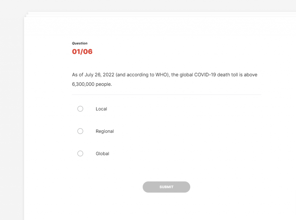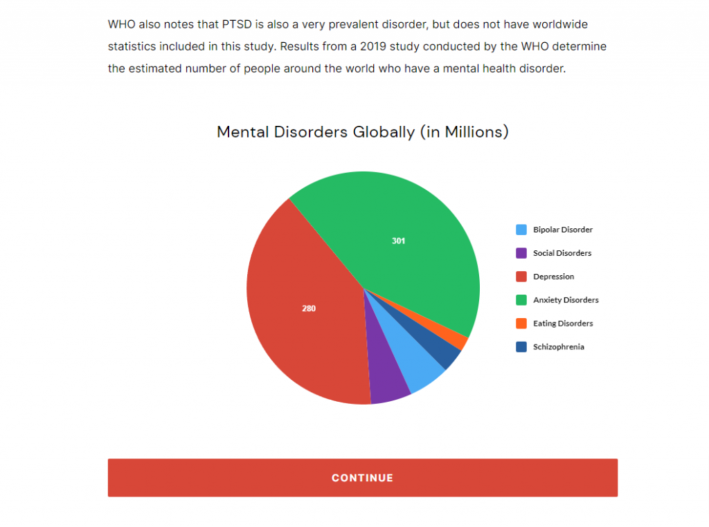 Interactive pie, line, and bar charts can be added to lessons to visually aid data for the learner. Extra information will appear when interacting.